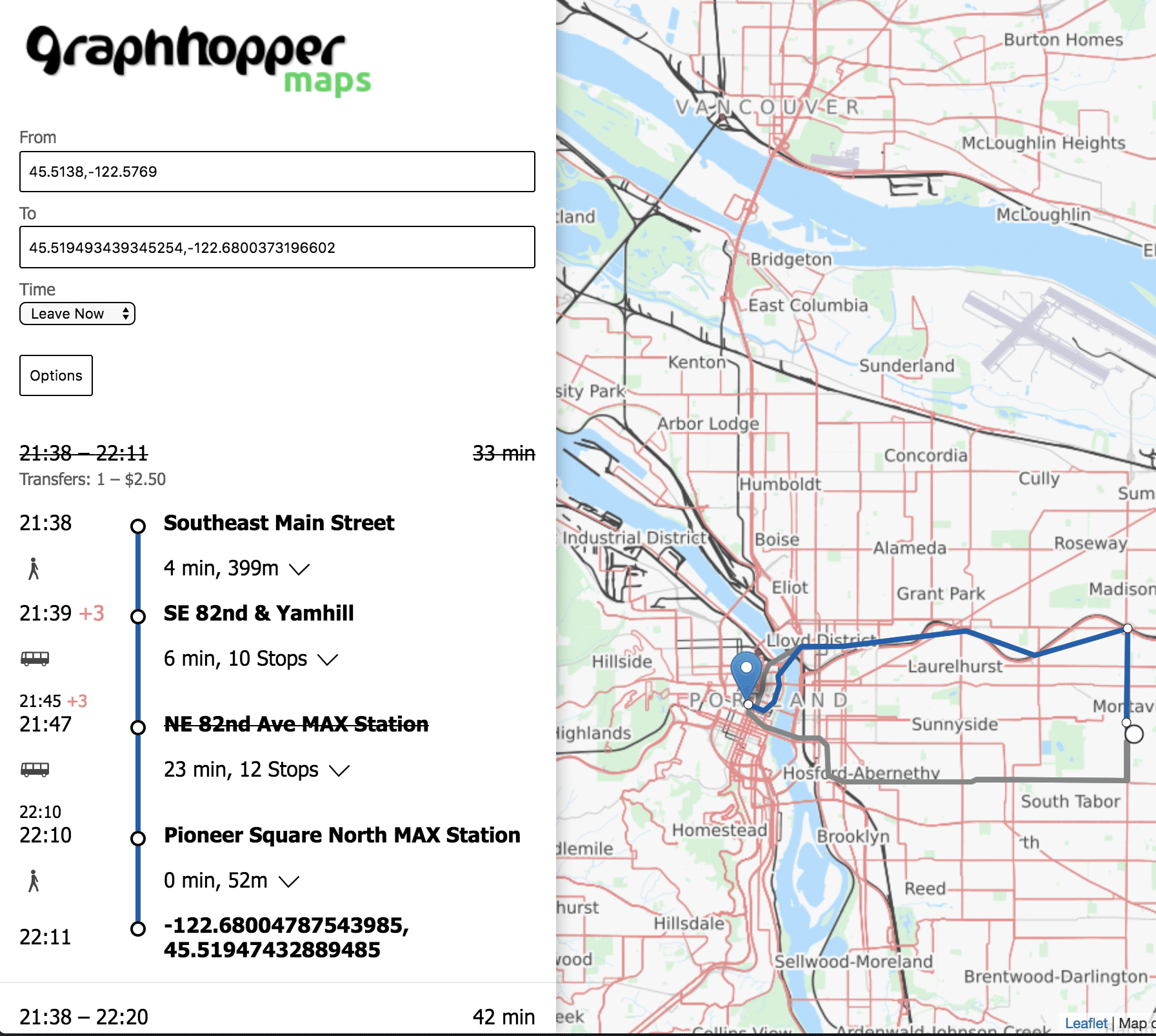 Today, we would like to show you a demo of a feature we’ve been quietly working on for over a year: Real-time public transit routing. Grassroots transit apps depend a lot on open data published by operators. Trimet of Portland, Oregon, publishes both their schedule and realtime updates. This is what it looks like when […]