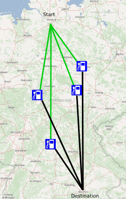 In our Hamburg-Munich case the result is the following tour of ~750km and roughly 8.5 hours plus the time required for charging or replacing the battery at this charging station in Erfurt. Compare this to the normal route which takes only 8 hours and is 775km long.
