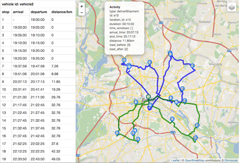 Modelling the entire problem with random addresses in Berlin yield this json file. Post it to our servers and you get back the following solution:
