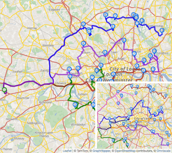 Obviously travel times vary significantly throughout the day. Our new time-dependent Route Optimization API takes this into account. It considers detailed historical traffic information from TomTom within the optimization. For each road and time of day we are provided with travel time data aggregated from millions of anonymously-collected data points. In this way we are able to predict travel times much more precise which in turn yields more realistic and cost effective vehicle route plans. In this blog post, we illustrate the impacts of considering traffic within the optimization.