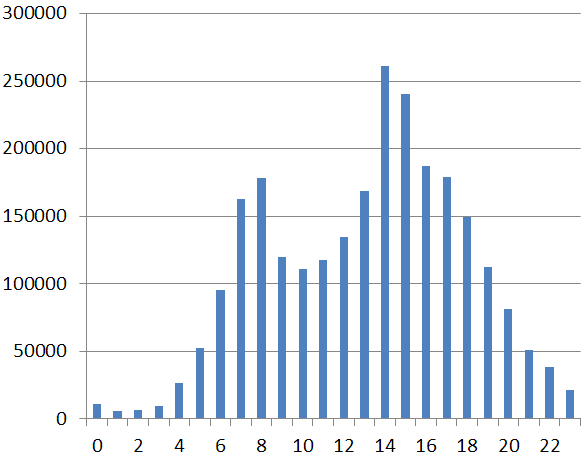 As an example, let us rerun the robo-taxi simulation with the ride-sharing option and assume that up to 4 passengers may share a taxi at the same time and detours are allowed as long as the travel (wait + ride) time does not exceed 1.5 * t + 15 [min], where t is the direct (unshared) ride time from origin to destination. Whenever a new request arrives, the optimisation algorithm inserts the pickup and dropoff into the route of one of robo-taxis so that no constraint is violated (e.g. capacities or time windows) and the overall fleet operation time is minimised. By doing this, we try to maximise ride sharing and reduce the total mileage, which leads to reductions both of the fleet size and traffic volumes. As a result, we are now able to replace 1.1 million of passenger cars with a fleet of only 60,000 robo-taxis. The following chart illustrates the fleet-wide hourly ride sharing levels.