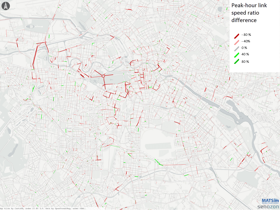 All in all, the obtained results indicate that 1.1 million private cars could be replaced by 100,000 robo-taxis, which gives a replacement ratio of 1:11. However, fewer cars does not mean less traffic. Robo-taxis lead to a higher traffic volume due to empty mileage on drives between customers (the blue colour in the second chart), which is particularly high during peak hours. This significantly deteriorates the traffic conditions. In particular, traffic in the city centre is affected most, as illustrated on the following map showing differences in speed ratios (the ratio between the observed average speed and the maximum/free-flow speed on a link).