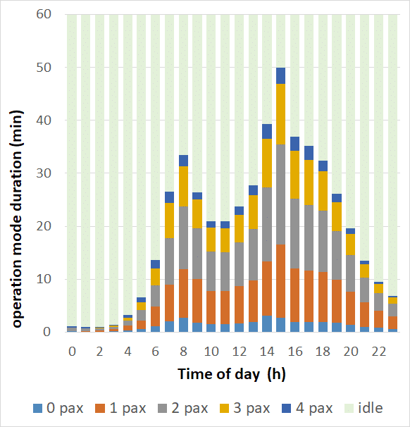 Hourly vehicle utilisation (0 to 4 pax – busy vehicles with 0 to 4 passengers on board, idle – waiting vehicles)