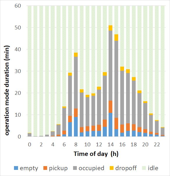Hourly vehicle utilisation (empty – driving empty, pickup –picking up a passenger, occupied – driving with a passenger on board, dropoff – dropping off a passenger, idle – waiting)