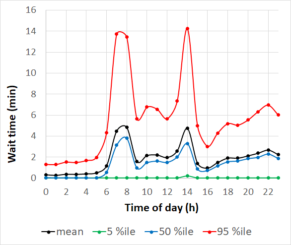 Passenger wait times over the day (mean, 5th percentile, median, 95th percentile)