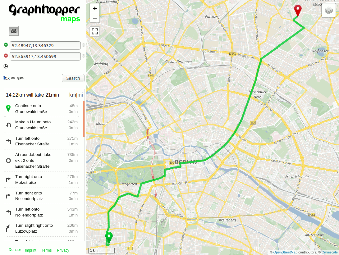Now open the GraphHopper Maps demo UI that is available on your local machine: http://localhost:8989/maps/?point=52.48947%2C13.346329&point=52.565917%2C13.450699&profile=car