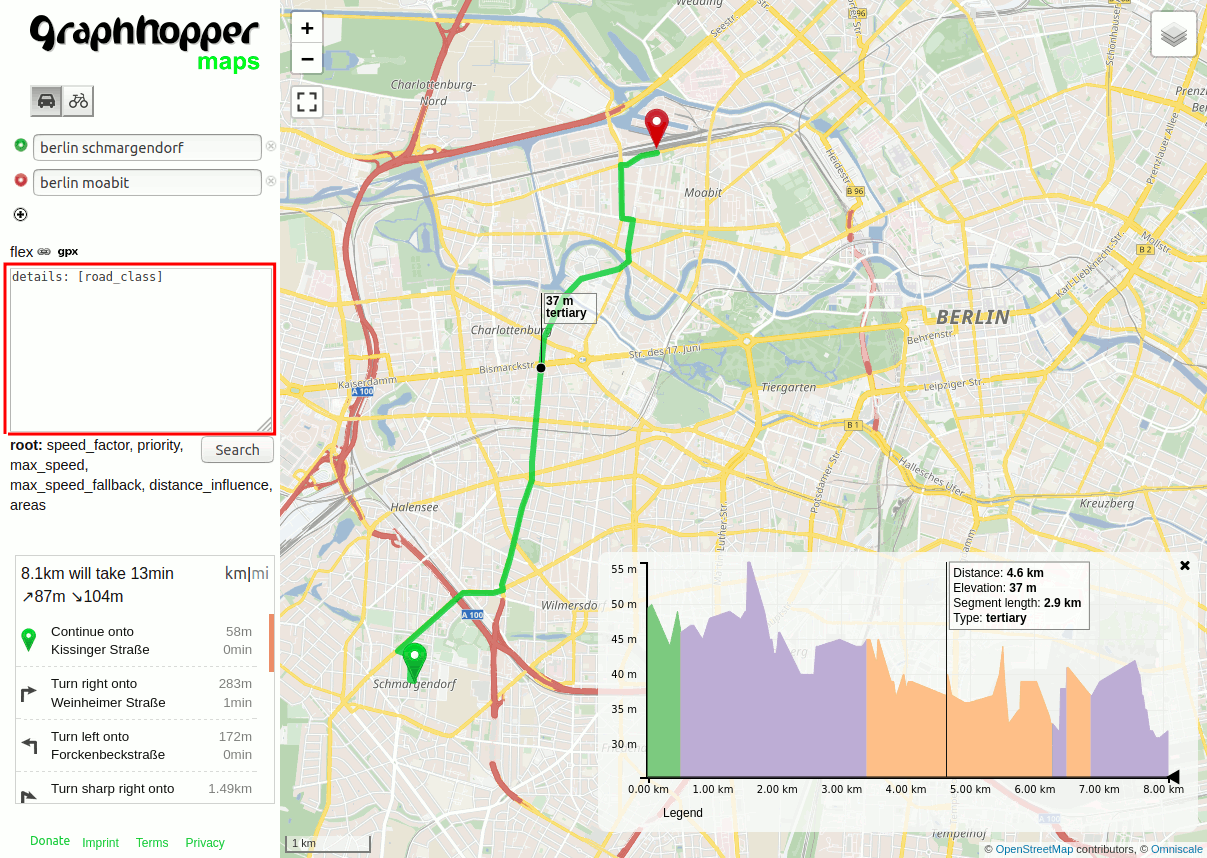 Customizable routing: Without knowledge of Java and just some JSON (or YAML) configuration you can now tweak the default vehicle profiles. You can do this on a per-request basis, but also use your configuration with the fast hybrid- and speed modes. Use this to avoid bridges, motorways, ferries, steps or certain areas, avoid roads with truck limits, change the speed or max_speed variables or prioritize certain road classes like official bike routes. You can get very creative here! From @karussell and @easbar. To find out more see the documentation, issue #1841 and this blog post. Or try on this demo server and click on the flex icon near the ‘Search’ button.