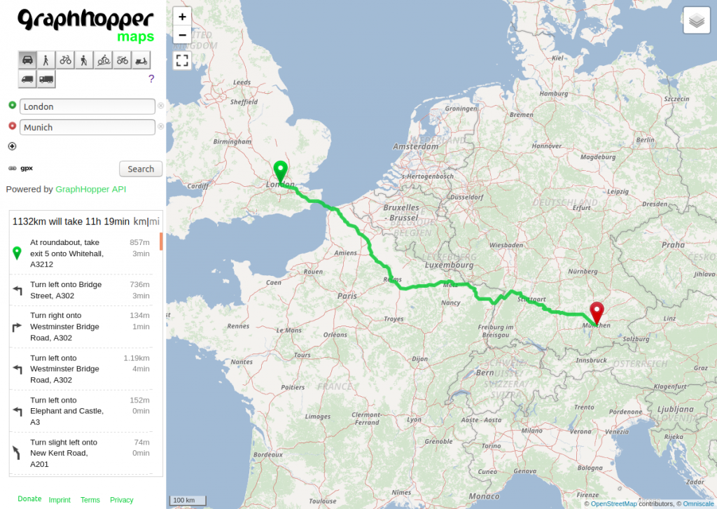 GraphHopper calculates optimal routes in road networks (for example taken from OpenStreetMap) for many different vehicle types and finds the ideal itinerary when using public transit. It is released under the Apache License 2.0 and you can easily try its road routing capabilities on GraphHopper Maps. Besides the route calculations the GraphHopper engine offers a lot more features like the map matching (“snap to road”), the navigation and the isochrone calculation (for a point it finds all reachable roads within a specified time). See the end of this post for some impressions and view GraphHopper on Github!