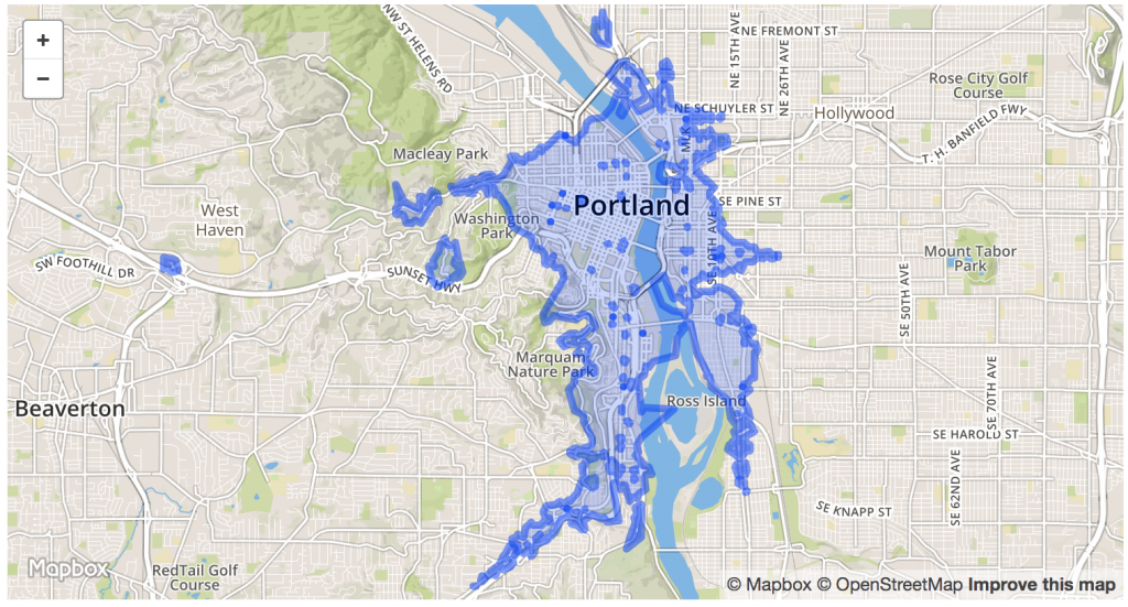 GraphHopper supports also public transit time-dependent routing using GTFS and OpenStreetMap data. Here the isochrone for 20 minutes is shown. Note the islands, and they are not artifacts, but part of the story. You can get to a far-away place, but you can’t get off the bus in between.