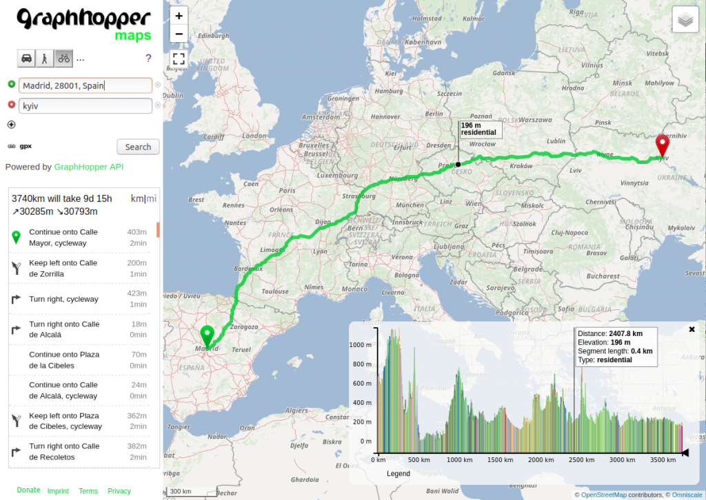 Customizable routing again: Here the bike mode is forced to prefer official bike routes even though this means a big detour. Another use case would be a cargo bike where additional properties like road width are taken into account.