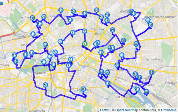 We have now extended our toolbox a bit more: we’ve made it possible to specify a minimum number of orders for each driver. Let’s illustrate this with an example. I have taken the problem above and put our four drivers and 50 deliveries somewhere in Berlin. If I now minimize the number of drivers and the time it takes to process these 50 deliveries, I get the following picture: