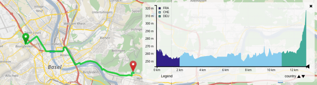 You can not only show the different encoded values (like the country) along a route, but you can also use them to adjust the routing. If you have not heard about this feature yet make sure to read this previous blog post. Here is an example where we calculate the route between the same locations, but avoid going through Switzerland: