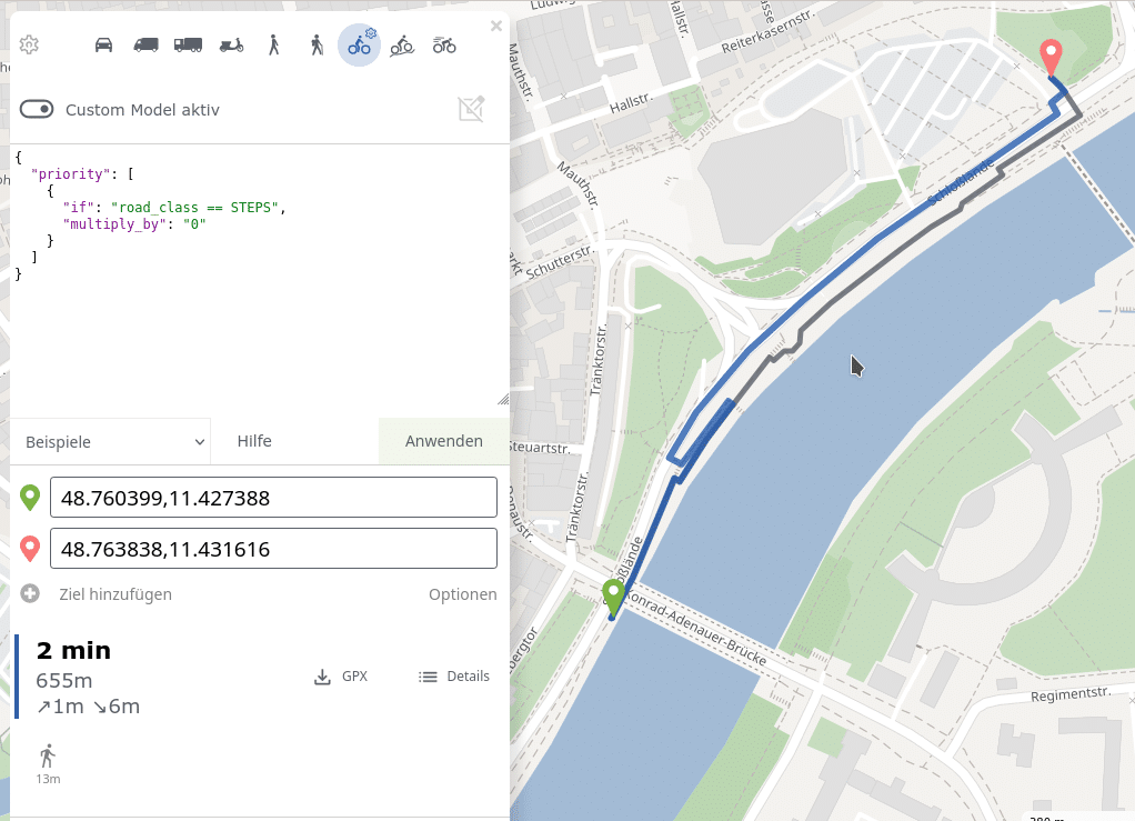 Afterwards you can modify the custom model to avoid some of these obstacles. To enable the custom model: click on the gear button in the top left corner and select one of the examples and click “Apply”. E.g. to avoid steps you can use this custom model and the route hint with the steps will disappear. Click on the custom model activation button to activate and deactivate the custom model to see the difference: