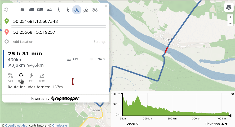 In the past GraphHoper Maps showed obstacles or special cases on the route, but it wasn’t easy to find out where exactly you’ll face them and for how long. These “obstacles” could be steps for a bicycle route or a ferry or if you need to cross borders and so on. Now we made it easy to find out about the details of an obstacle: just click on the “route hint” button below the route result to let the map zoom to it and the route segment will be highlighted in red to indicate exactly where it is. Click the “route hint” button multiple times to loop through all occurrences e.g. when there are multiple ferries.