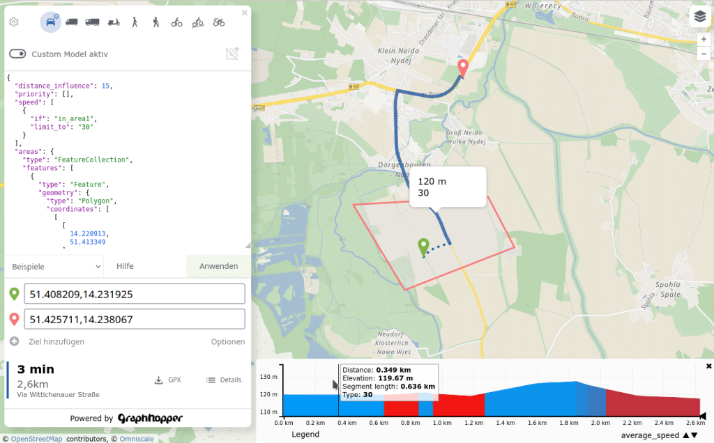 Or, if you want to modify the speed in this area you move the statement with the “in_area1” to the “speed” array. Often the route does not change from small changes like this but you can debug this easily and view the speed for every road segment in the elevation widget (bottom right corner), where you change the visible edge attribute to “average_speed” via the small triangles. E.g. for the next example you’ll see that all the speeds in the defined area have been set to 30km/h: