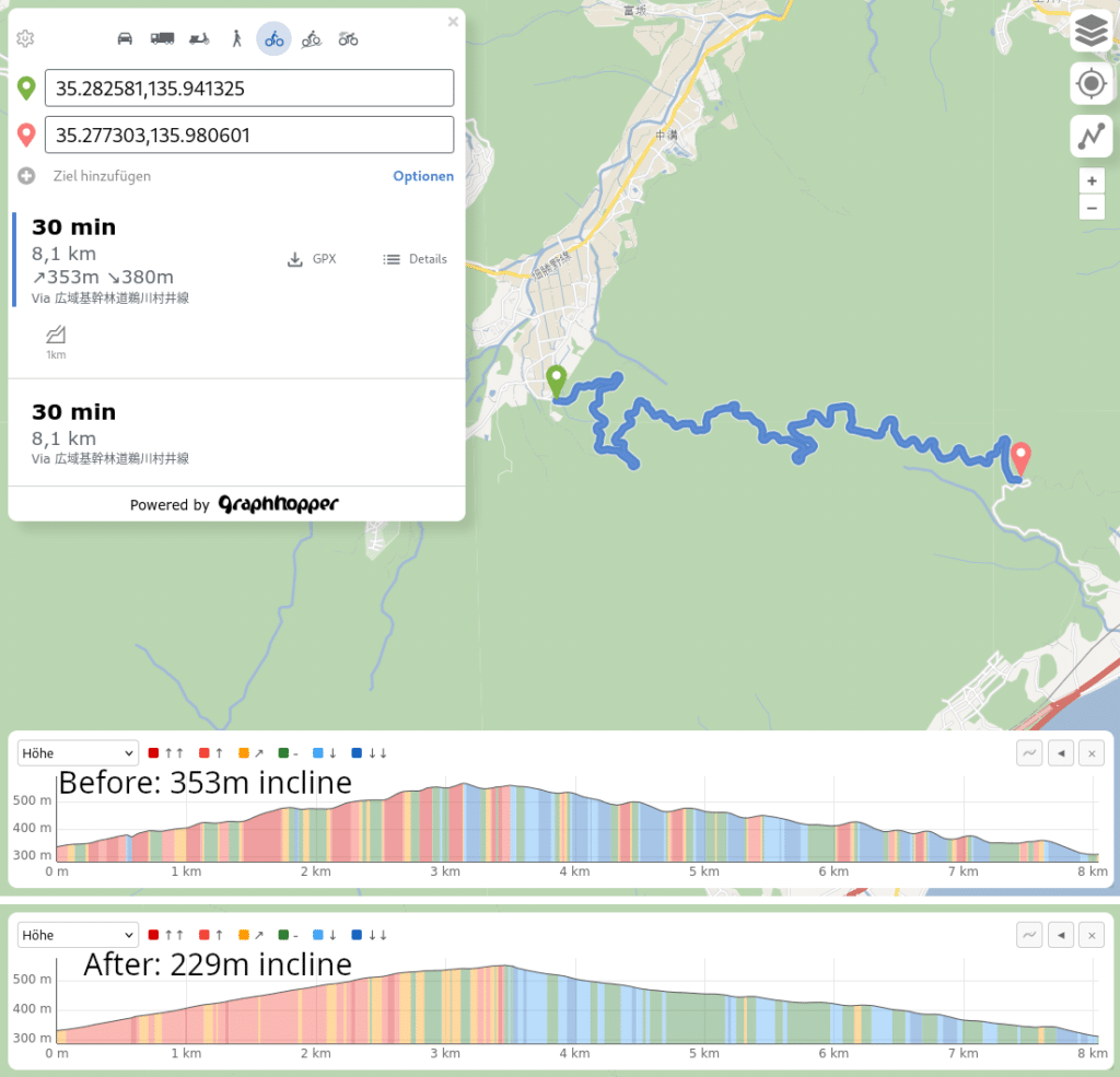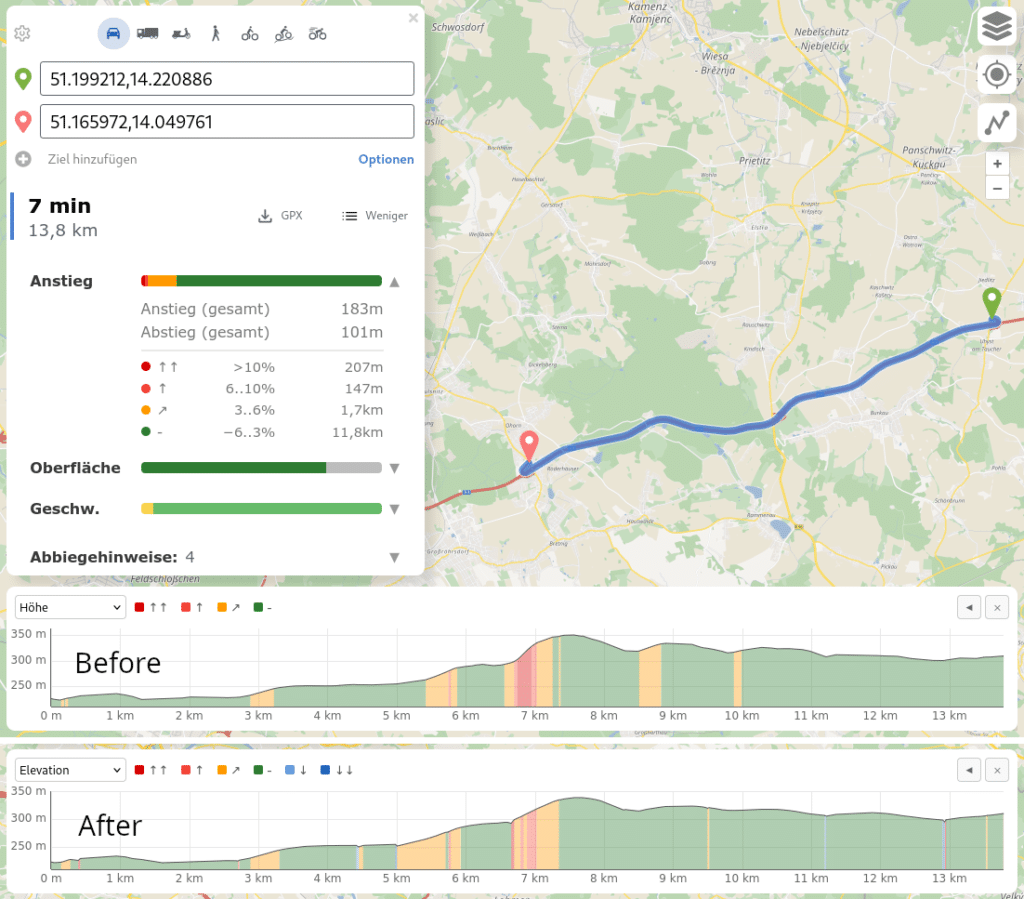In this example on a German Autobahn the total incline isn’t the important bit that improved but the sharp and incorrect incline above 10% was significantly reduced from 207m (see picture) to less than 100m (click image) which makes client-side energy estimates more precise.